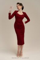This vintage-inspired dress is rich in color and is perfect for elegant occasions. Featuring a classic silhouette with long sleeves and a chic design neckline accentuated by a subtle cut-out detail. it combines modern flair with timeless style. The fitted bodice flatters the figure. cinching at the waist and transitioning into a midi-length skirt that falls gracefully below the knee. The deep burgundy hue exudes sophistication. making it suitable for both daytime and evening events. Paired with elegant accessories like gloves and a statement necklace. this dress is ideal for formal gatherings. cocktail parties. or any special celebration.