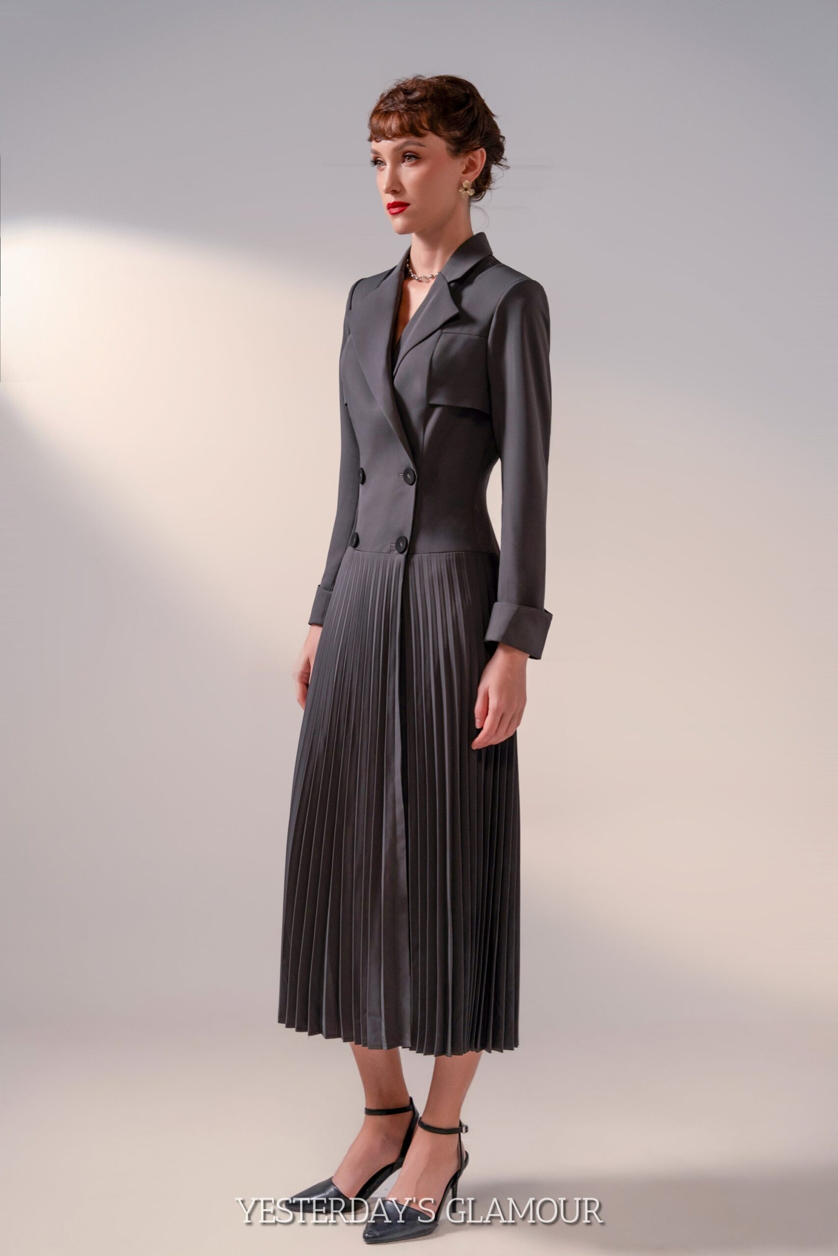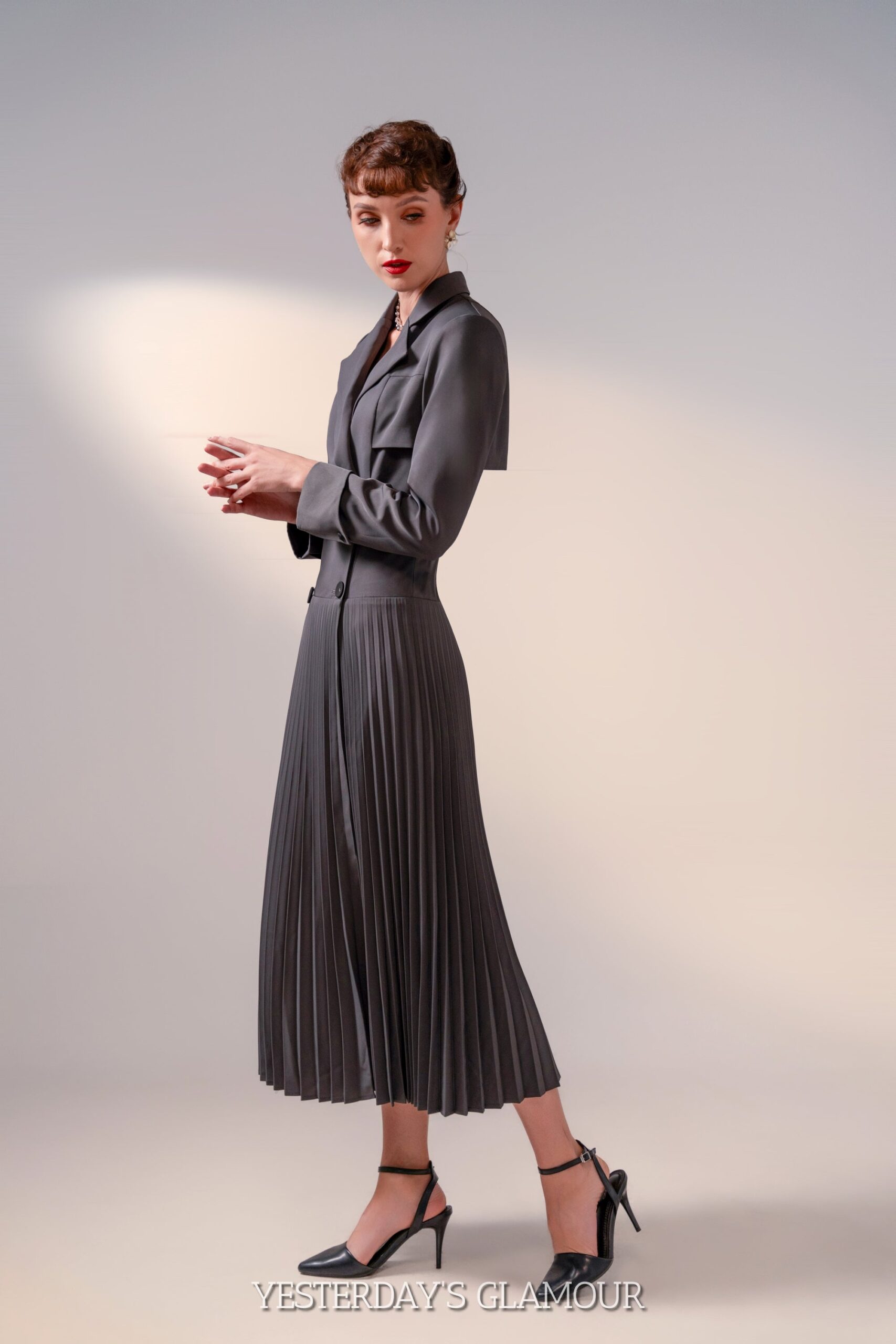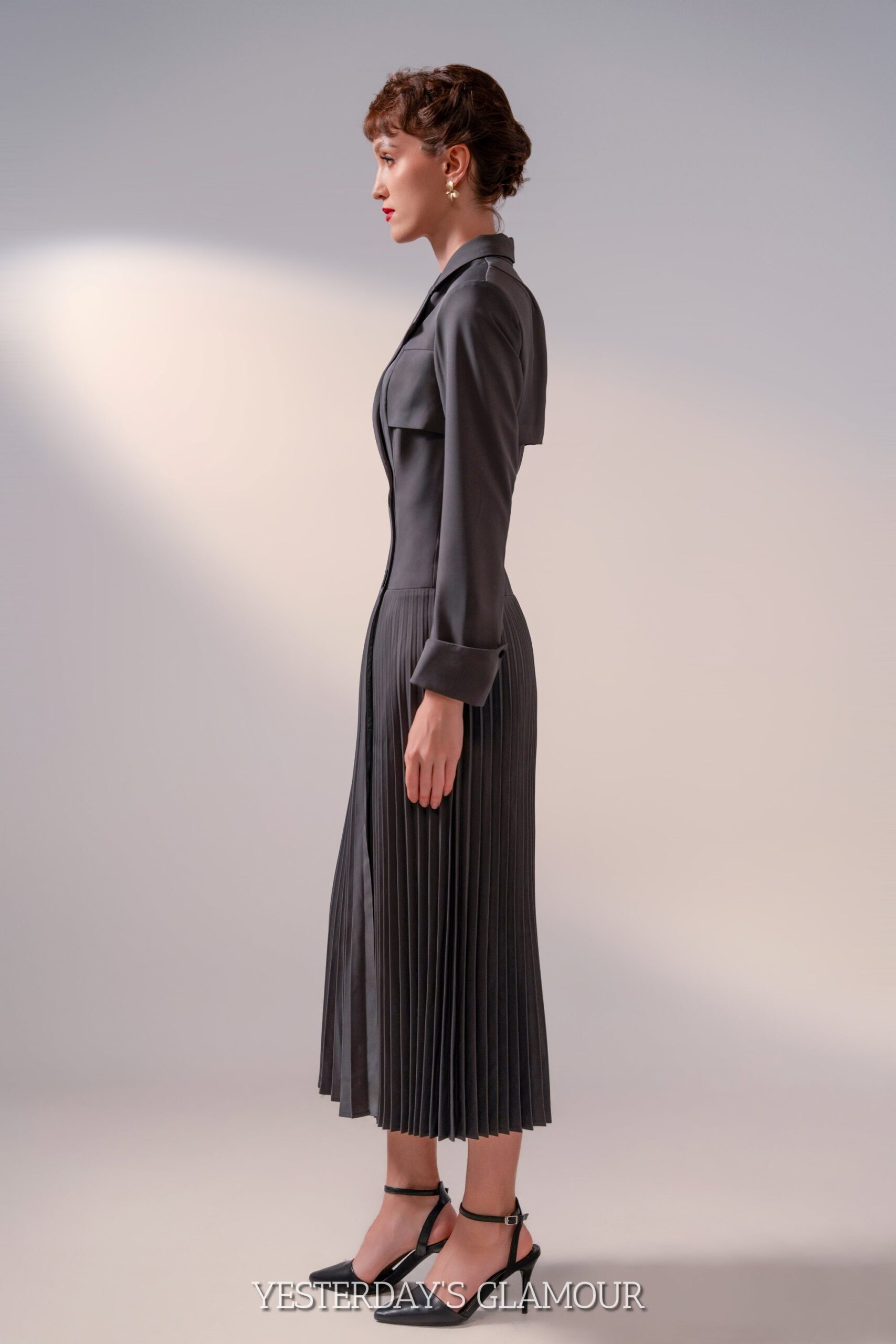 Transport yourself to the enchanting world of retro fashion with our women's shirtdress. showcasing a trompe-l'oeil bodice that evokes the timeless beauty of the 1950s. This dress effortlessly combines masculine elements. such as square shoulders. with feminine details. like a curved waist and a wide skirt adorned with permanent pleats. Embrace the allure of this vintage-inspired piece and relish in the heritage of fashion's golden era.